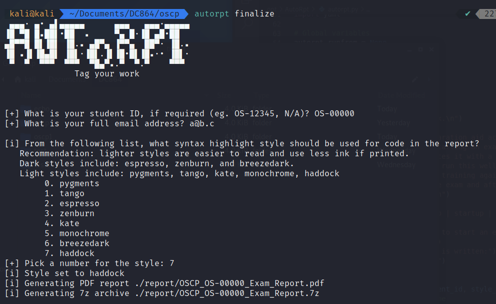 Now comes the need for the second parameter of AutoRpt, finalize, which produces the PDF and 7z similar to that of the noraj project. Verify the PDF content is correct. If a typo or change is discovered modify the original markdown file as needed and rerun autorpt finalize.