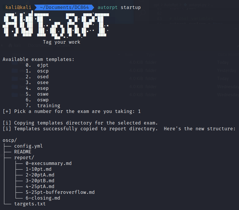 Continuing with the OSCP example, run autorpt startup and pick option 1.
